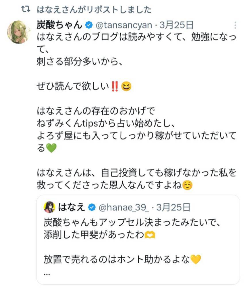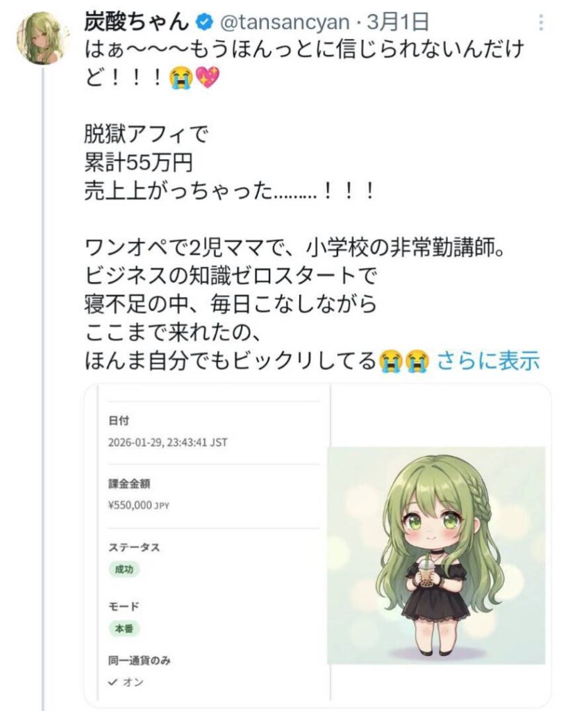 ちなみに炭酸ちゃん自身も構造をよく理解している人で、ポストでも語っているように、よろずや界隈に入って実績ゼロからたった3ヶ月で月50万円を超えました。