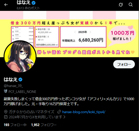 プロフィールの位置情報にはなえブログのリンクを置いてあるからXに来てくれた人はそこからブログへ流れていきます